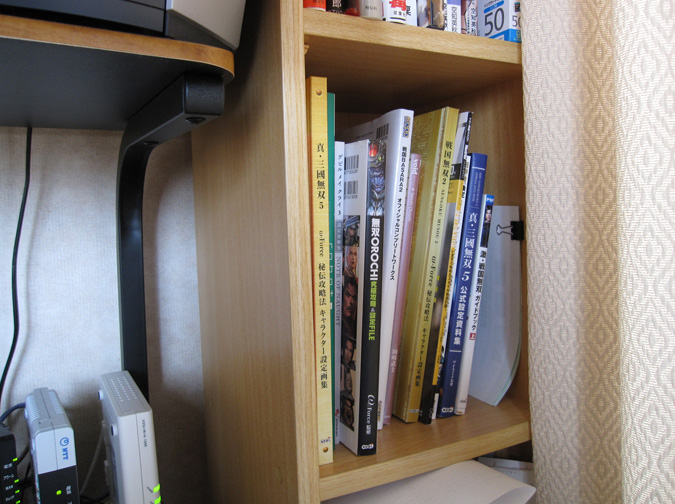 右側には背の高い本棚があります。設定資料集などが入ってます。