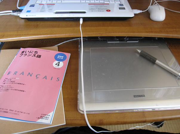キーボード置くところにペンタブ。wacomです。